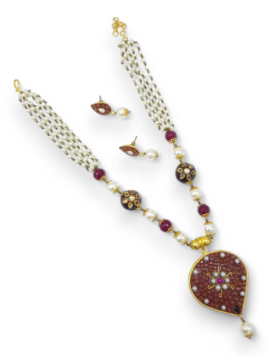 ELEVATE YOUR STYLE WITH THIS STUNNING LONG NECKLACE SET WITH PENDANT FEATURING A UNIQUE POLKI STONES. WE HAVE MADE THIS PIECE IN EMERALD & RUBY, PEARL, RUBY, RUBY & EMERALD COLOR ARRAY. IT HAS A SMOOTH HIGH GOLD COATING MADE FROM DURABLE BRASS & COPPER ALLOY. THIS LONG NECKLACE SET WITH PENDANT IS ELEGANT & CAN BE ENJOYED FOR YEARS TO COME, MAKING IT A PERFECT ADDITION TO YOUR JEWELRY COLLECTION.